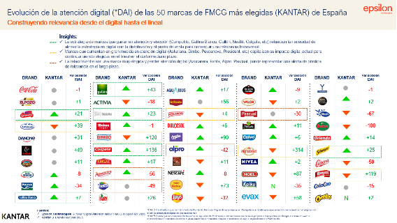 Análisis Digital Attention Index (DAI) de Epsilon Technologies FMCG 2025 vs Brand Footprint de Kantar Worldpanel 2025